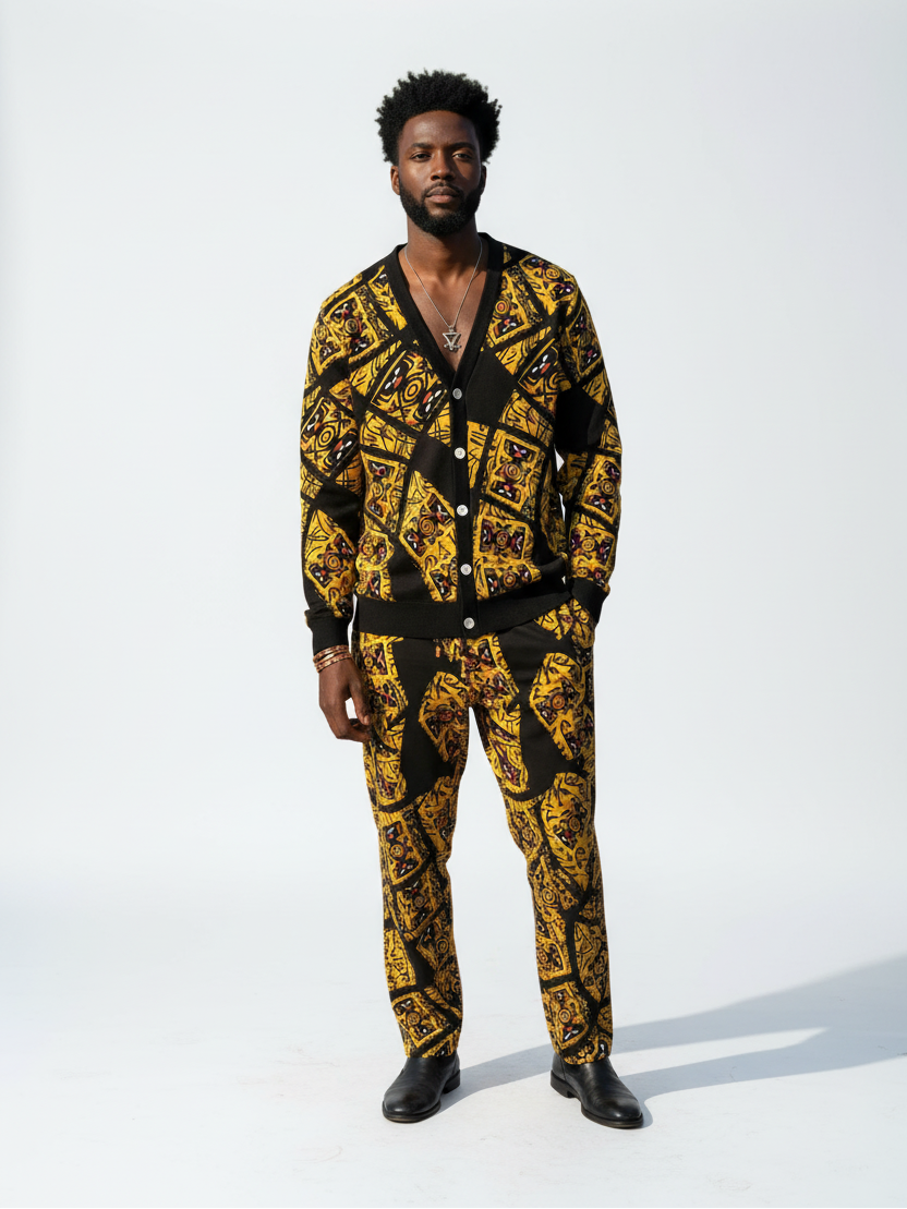 This men’s all-over print cardigan jacket and pants set is designed for comfort, style, and everyday versatility. Crafted from soft, breathable fabrics with just the right amount of stretch, it delivers a relaxed fit that moves with you—perfect for casual outings, lounging at home, or semi-casual work settings.